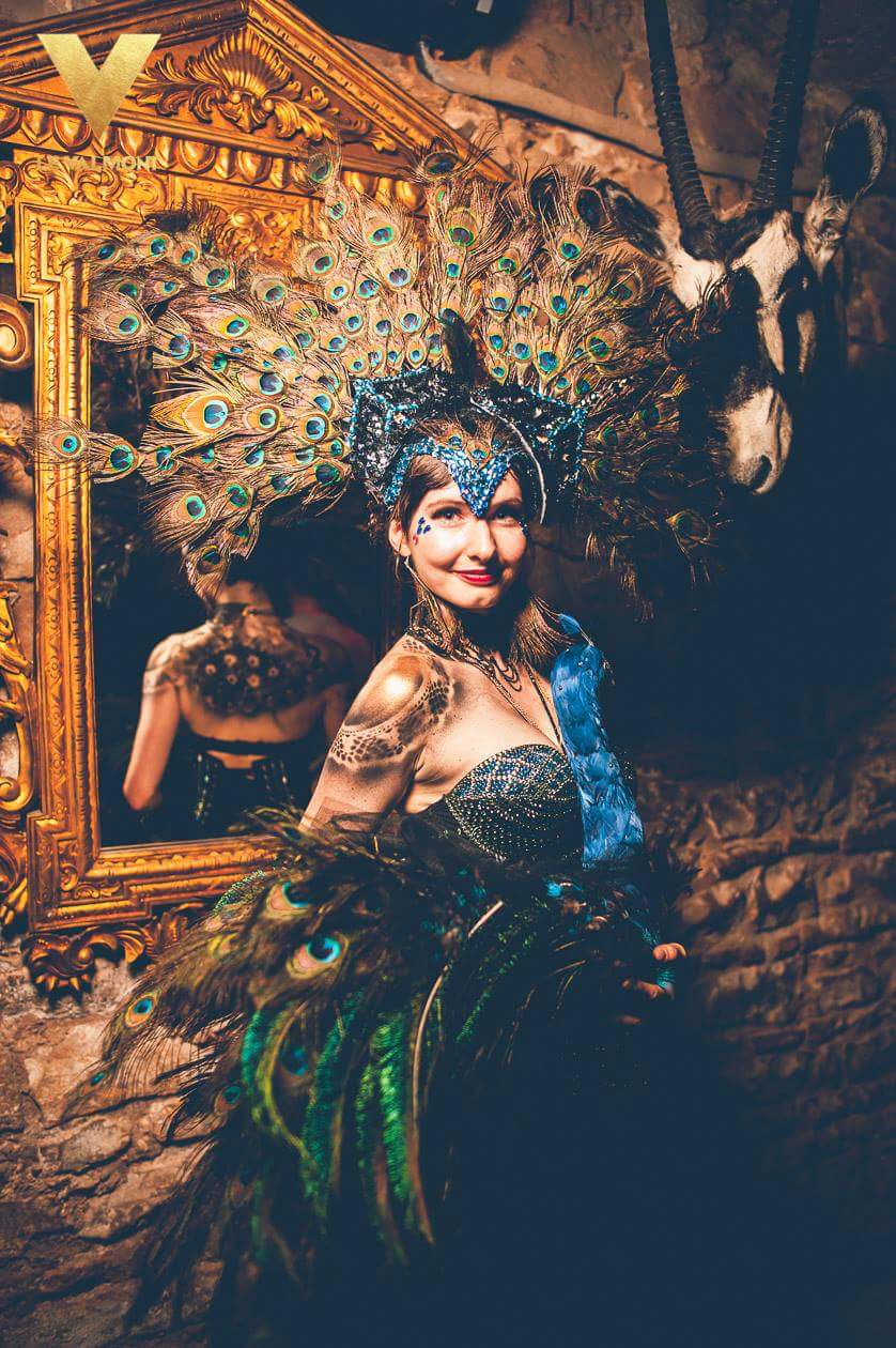 The Peacock Burlesque Cabaret is one of our most successful shows. Our designers have created this divine costume studded with hundreds of Swarovski stones and unique retro lingerie, tailor-made for our performer. The costume also includes countless real peacock feathers. We recommend this magnificent performance to anyone who wishes to impress at their events. You can also extend the performance by dancing in a giant champagne glass.
