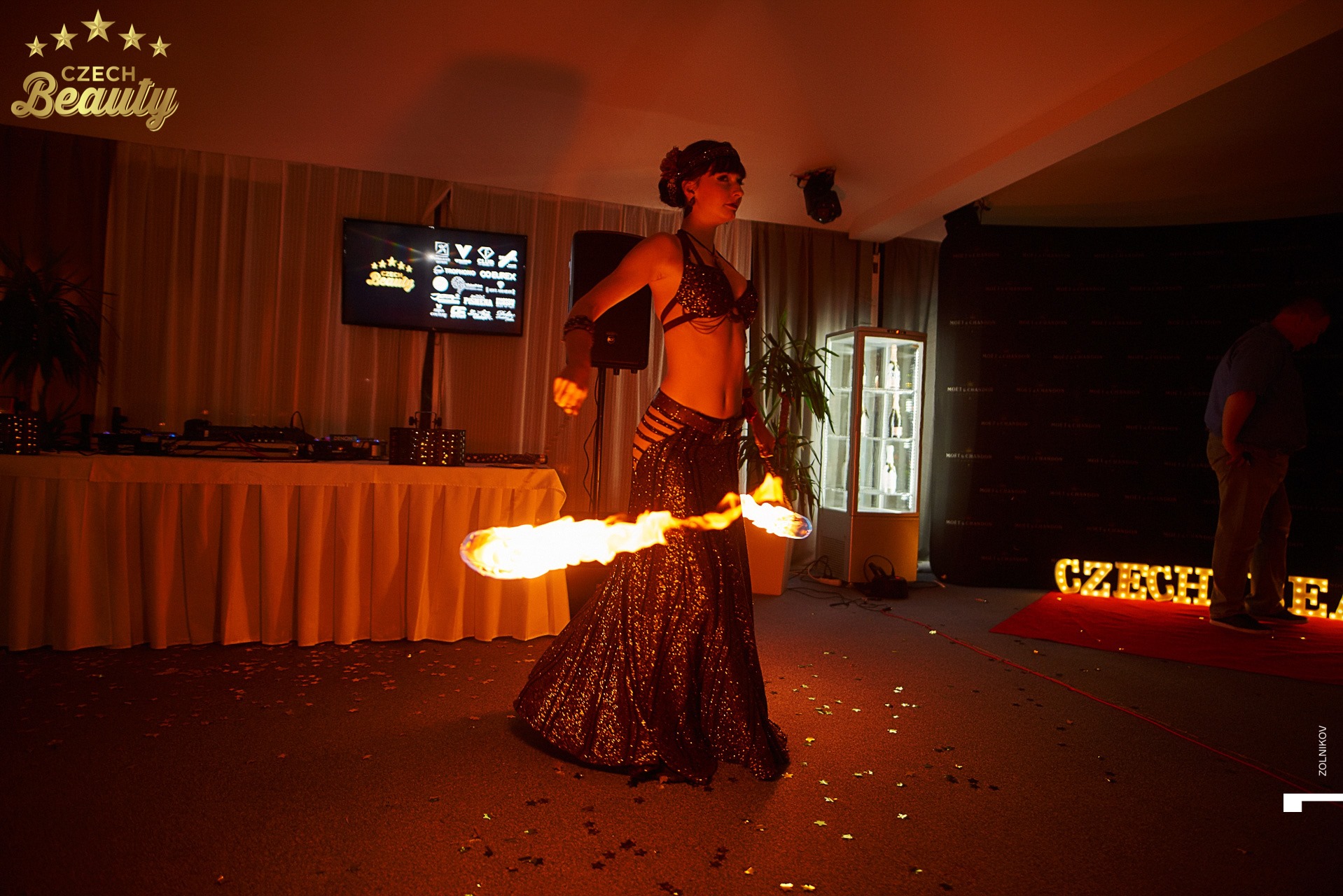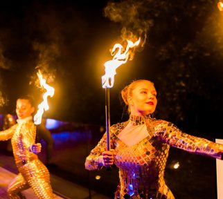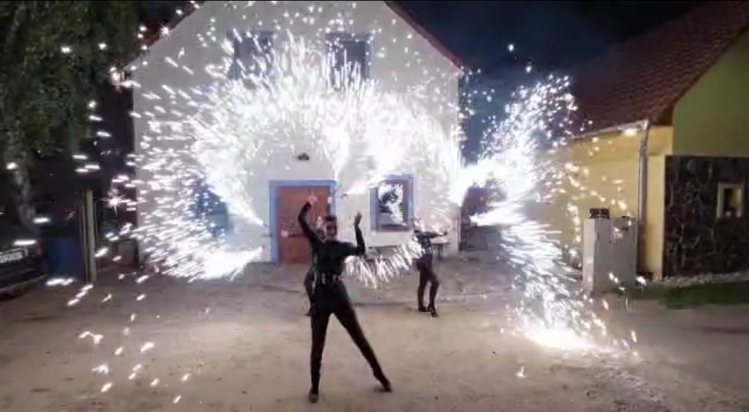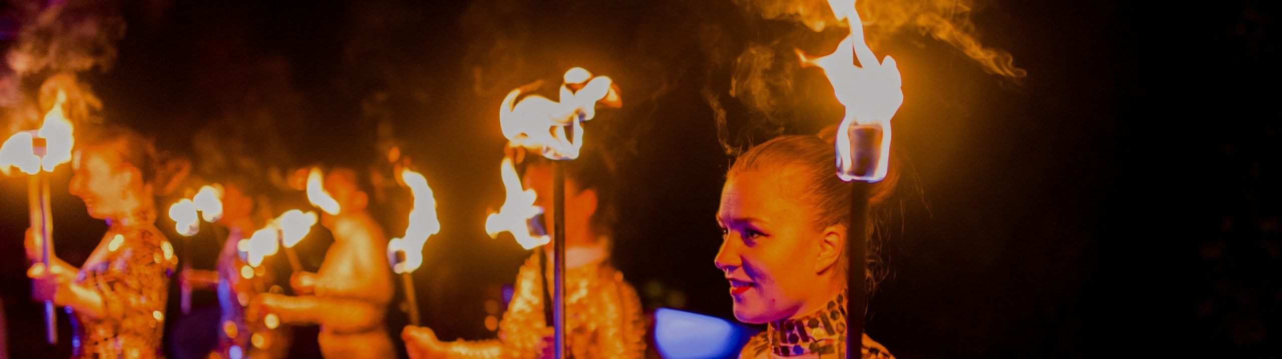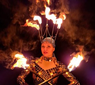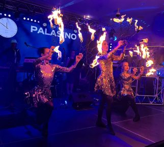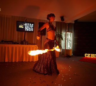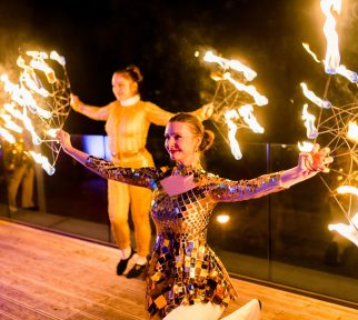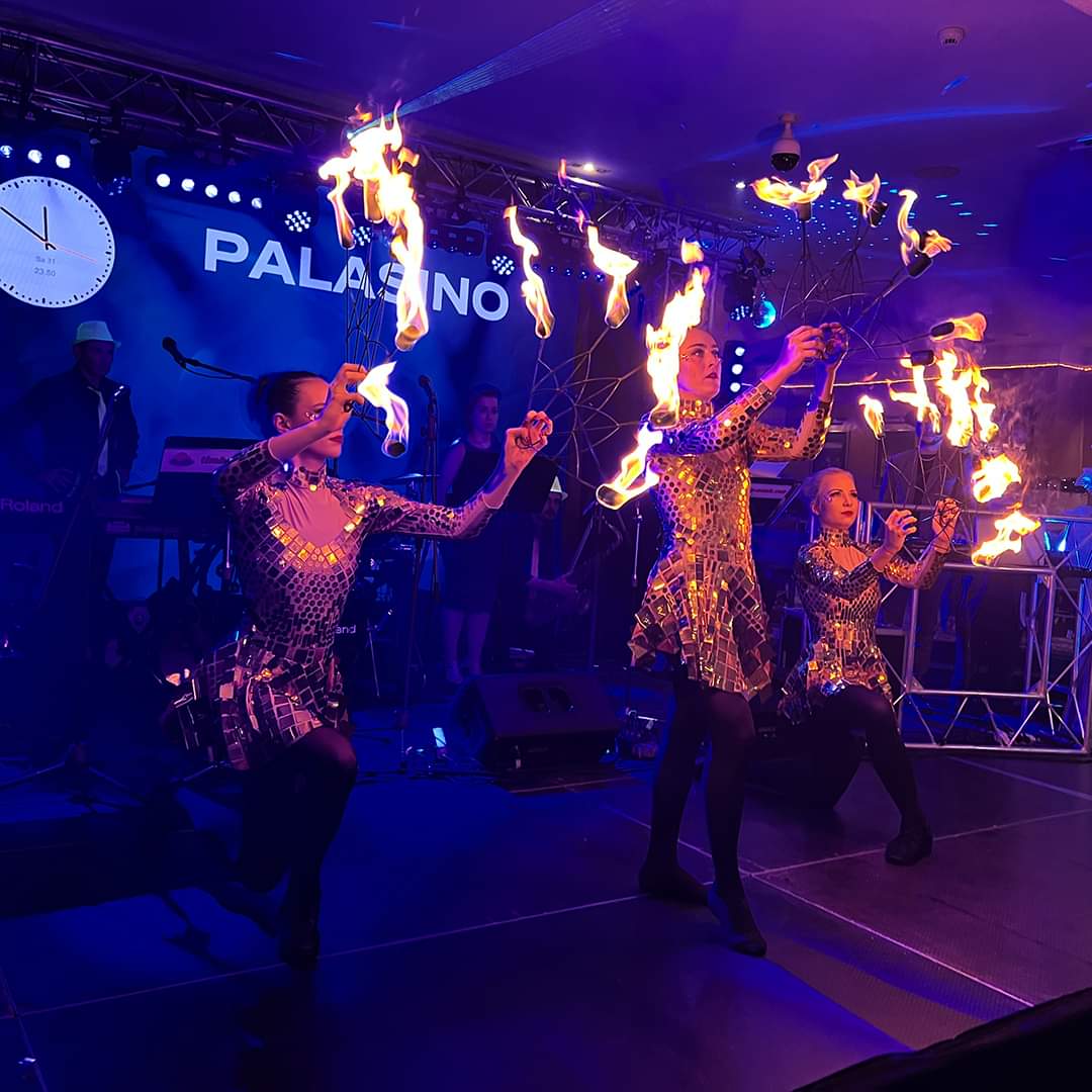 Seeing a breathtaking fire show is an experience of a lifetime. The combination of dance and the elements is one of our most successful shows and no wonder! We master several fire props. In our shows you will see poles, large flaming fans, beautiful crowns, „fire-poi“ or fire balls on chains and a fire umbrella. The fire-show combined with the art of dance will thrill audiences of all ages, and you can indulge in this powerful experience indoors. As a novelty, we also include spectacular pyrotechnic effects at the end.