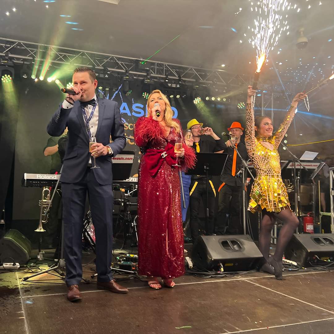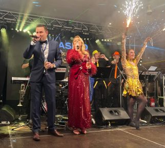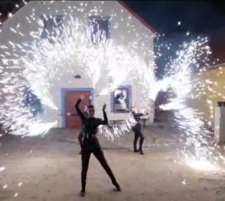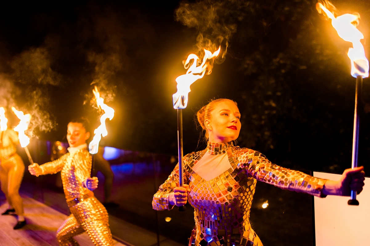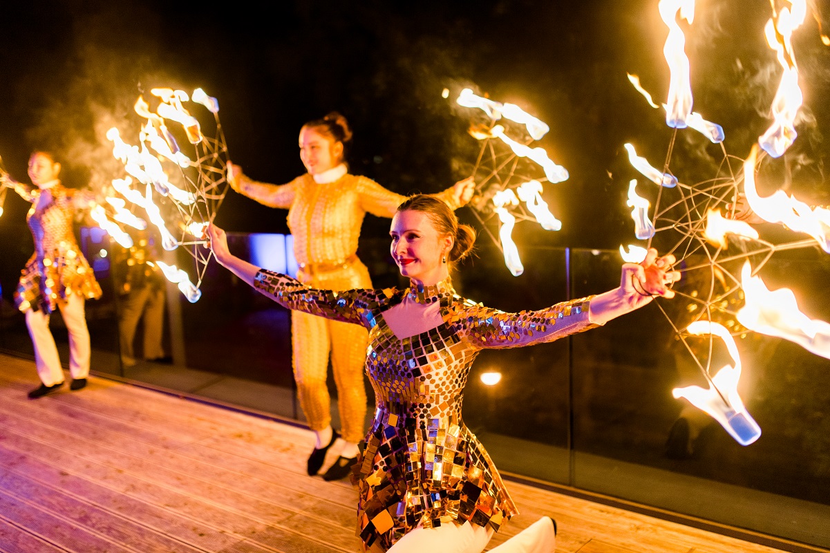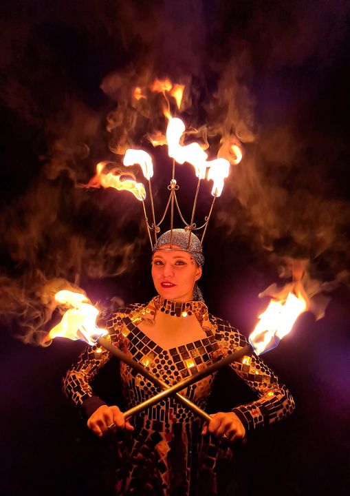 Seeing a breathtaking fire show is an experience of a lifetime. The combination of dance and the elements is one of our most successful shows and no wonder! We master several fire props. In our shows you will see poles, large flaming fans, beautiful crowns, „fire-poi“ or fire balls on chains and a fire umbrella. The fire-show combined with the art of dance will thrill audiences of all ages, and you can indulge in this powerful experience indoors. As a novelty, we also include spectacular pyrotechnic effects at the end.