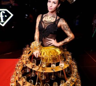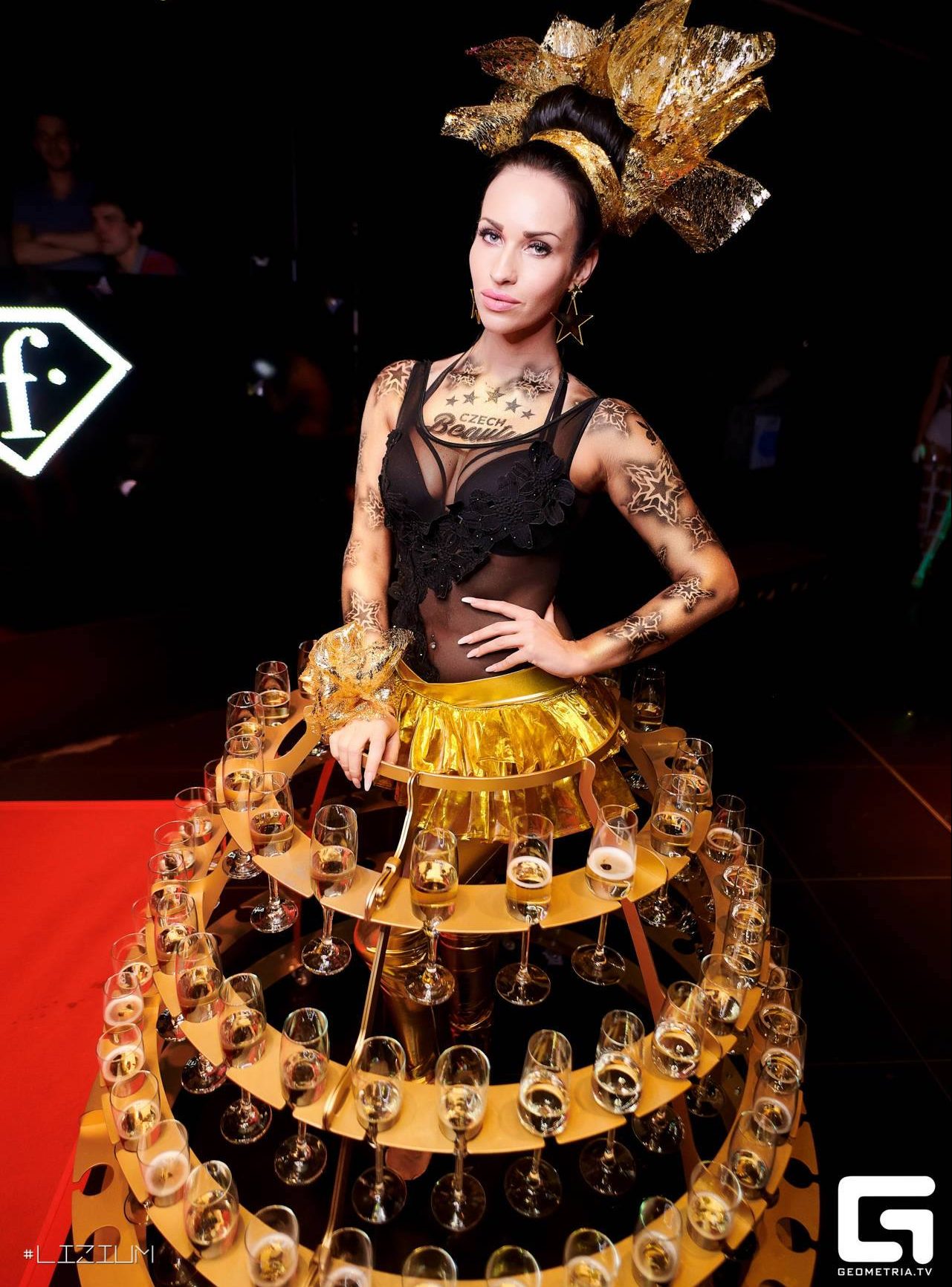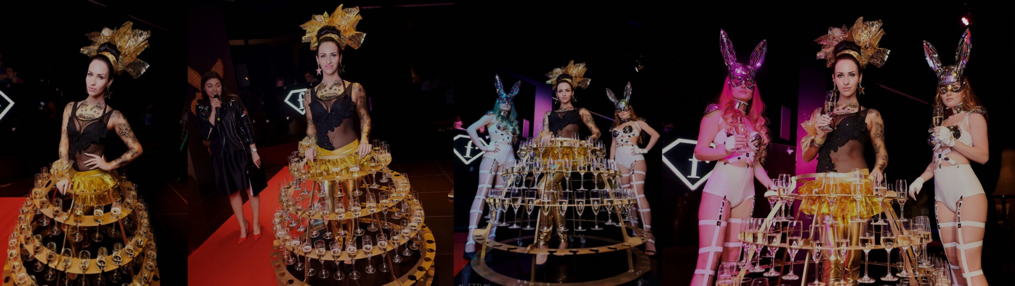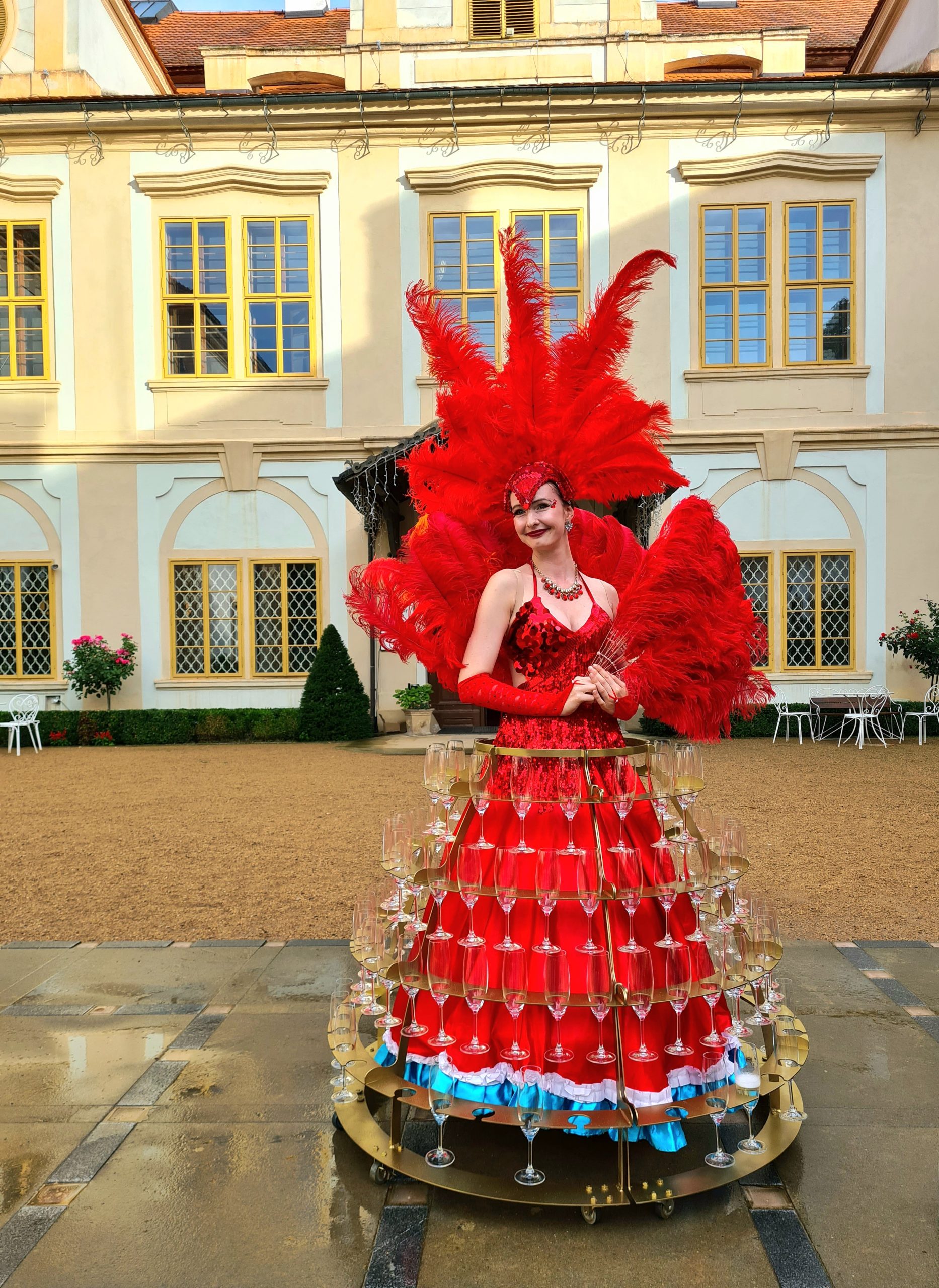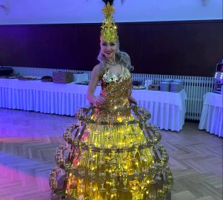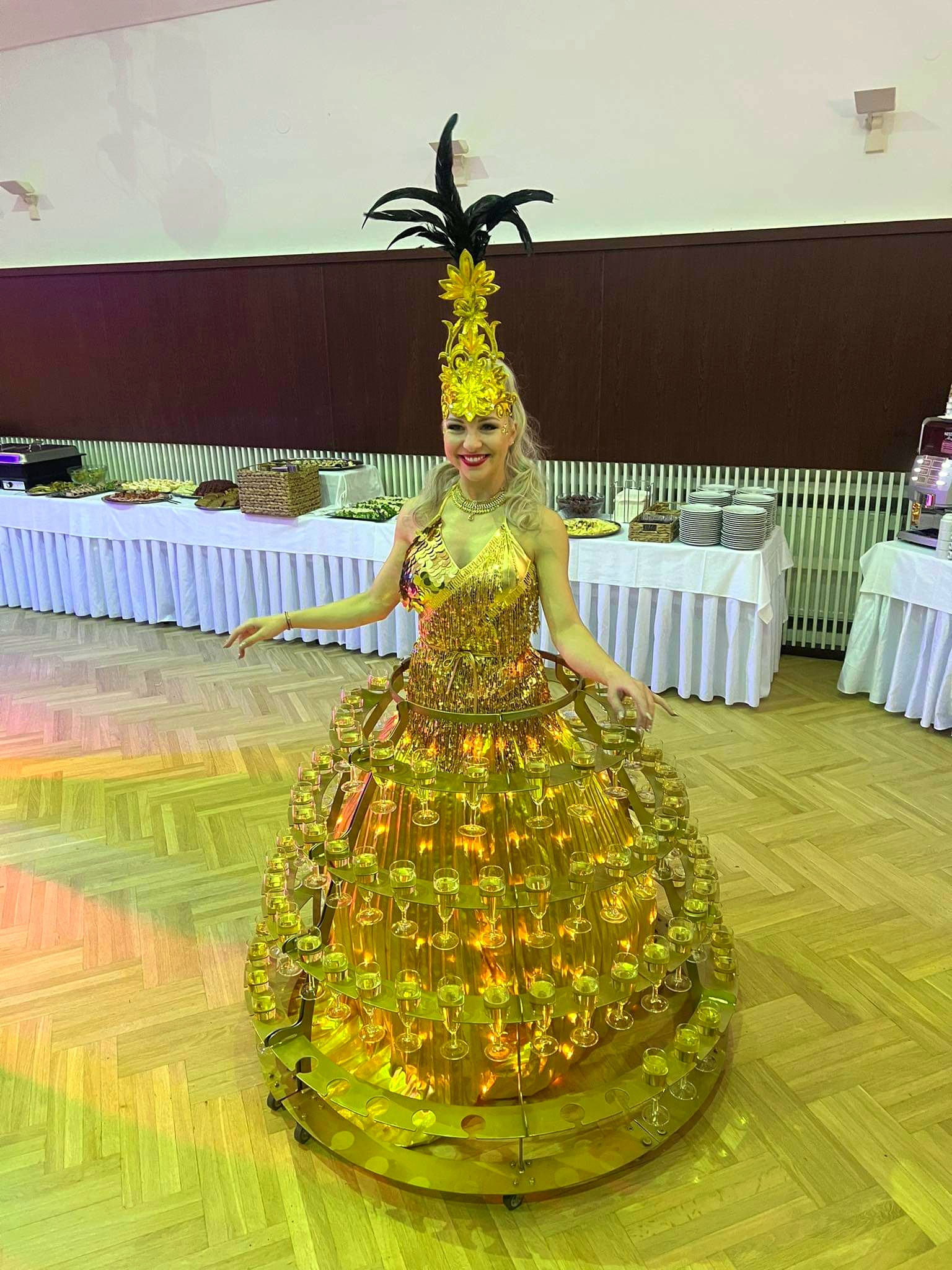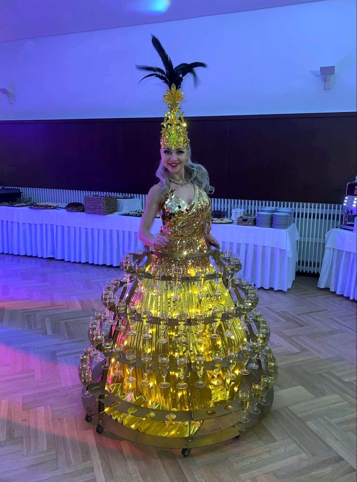 Designový stojan na kolečkách pro skleničky s šampaňským či vínem. Stojan ve zlaté barvě doplní naše krásná hosteska v šatech a kostýmech na přání. Stojan je možné pronajmout také samostatně. Kapacita je až na 114 skleniček.